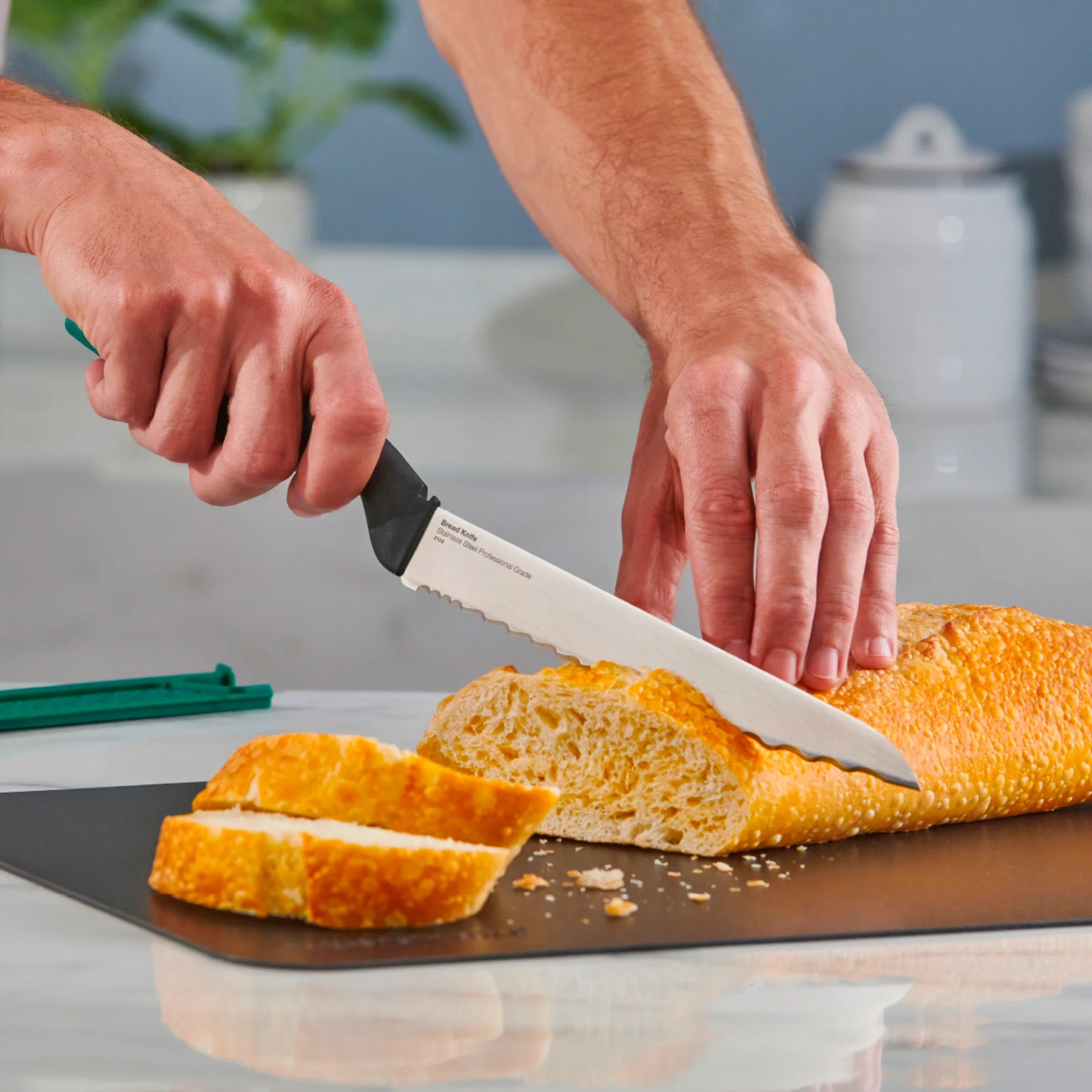 - Kenyérvágó-késnek fogazott pengéje van (3 eltérő rész) , ami simább vágásokat és kevesebb morzsát eredményez: szűk fogazat extra vágási hatékonyságért, hullámos penge sima vágáshoz, egyenes hegy a tökéletes szétválasztáshoz a vágások között.