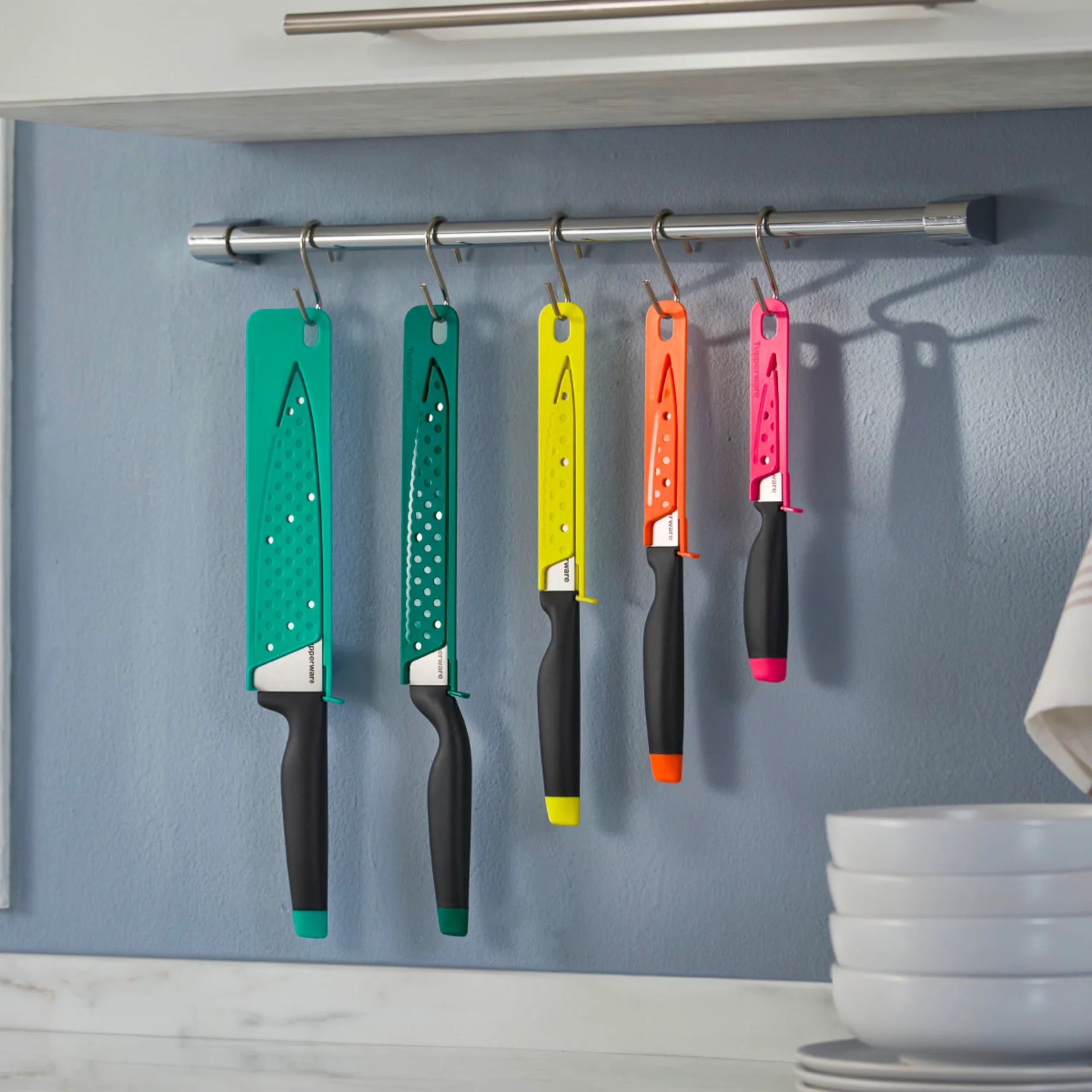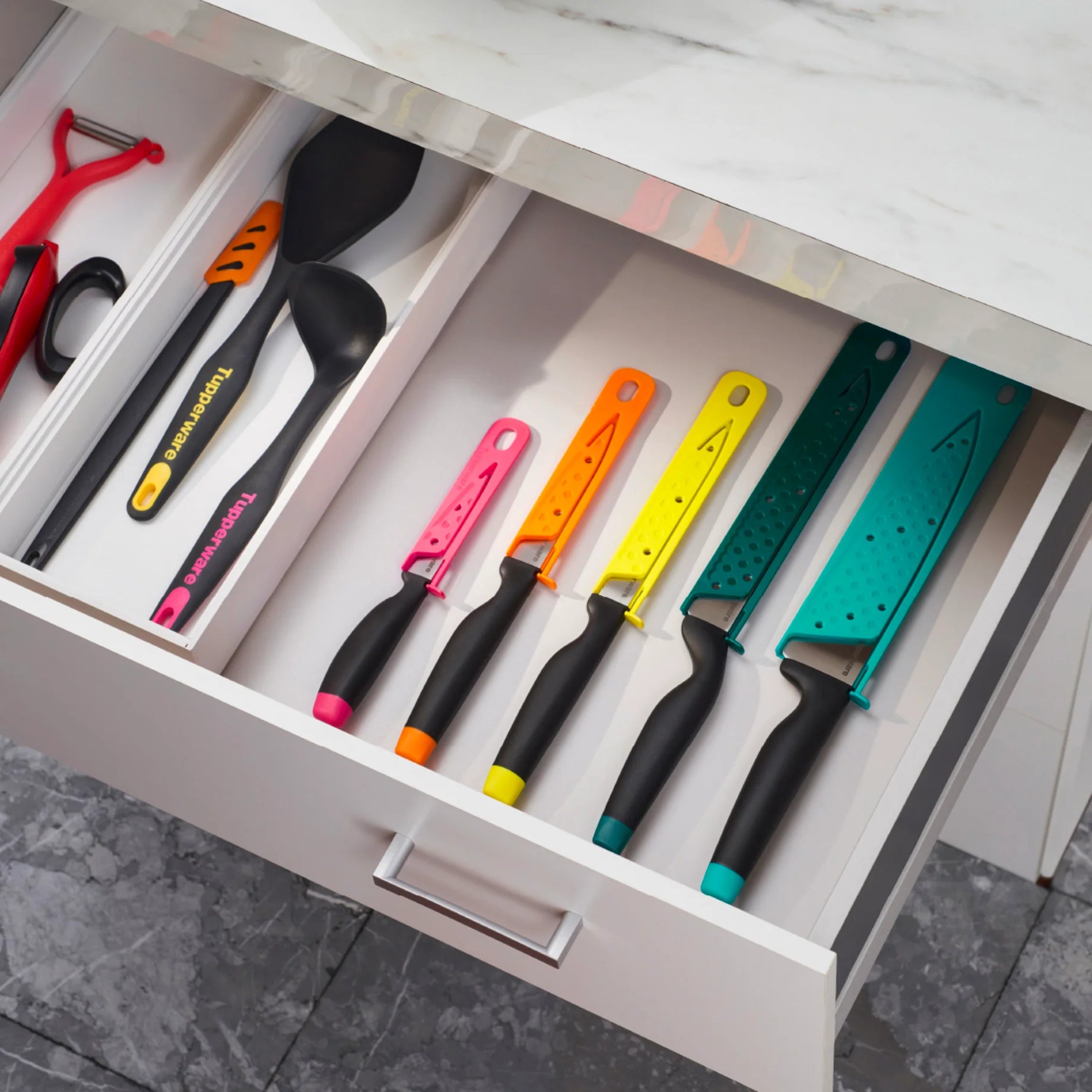 - A Tupperware A-generációs kések mindig kéznél vannak, a falon lógva vagy fiókban tárolva. Mindig biztonságos hozzájuk nyúlni, köszönhetően az új egyedi tokzárrendszernek.