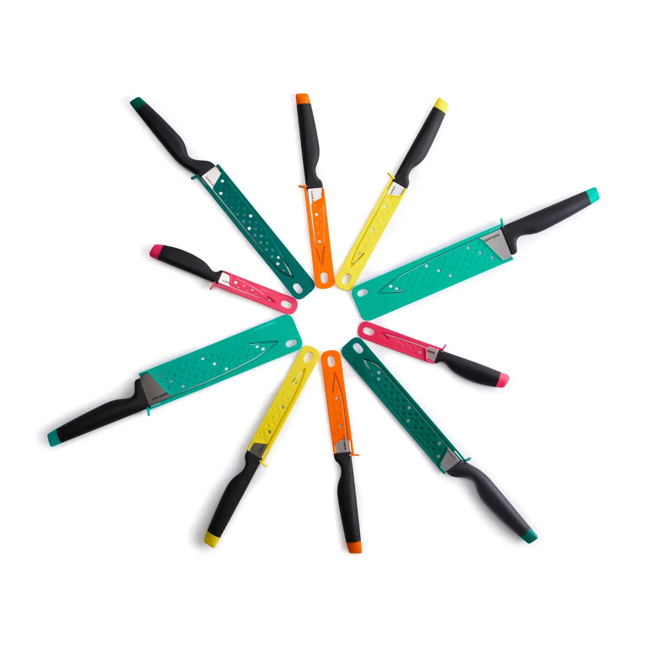 - Mindegyik késhez tartozik tok is (biztonsági zárral) a hozzáillő színben, amely tárolás során védi a pengét. Így lehetővé válik az is, hogy ezeket a késeket biztonságosan magaddal vidd az irodába, piknikre, kempingezésre vagy akár más nyaralásra is. Mindegyik késnek más a színe, így könnyebben meg lehet különböztetni őket egymástól. A tokok ugyanolyan színűek, mint a kések így sokkal egyszerűbb megtalálni a hozzá illő késeket.