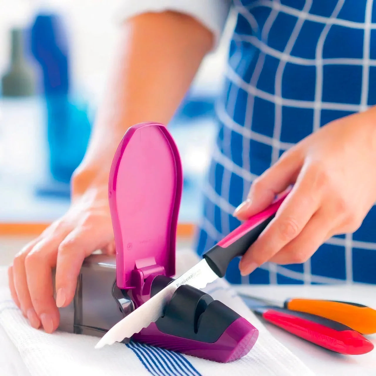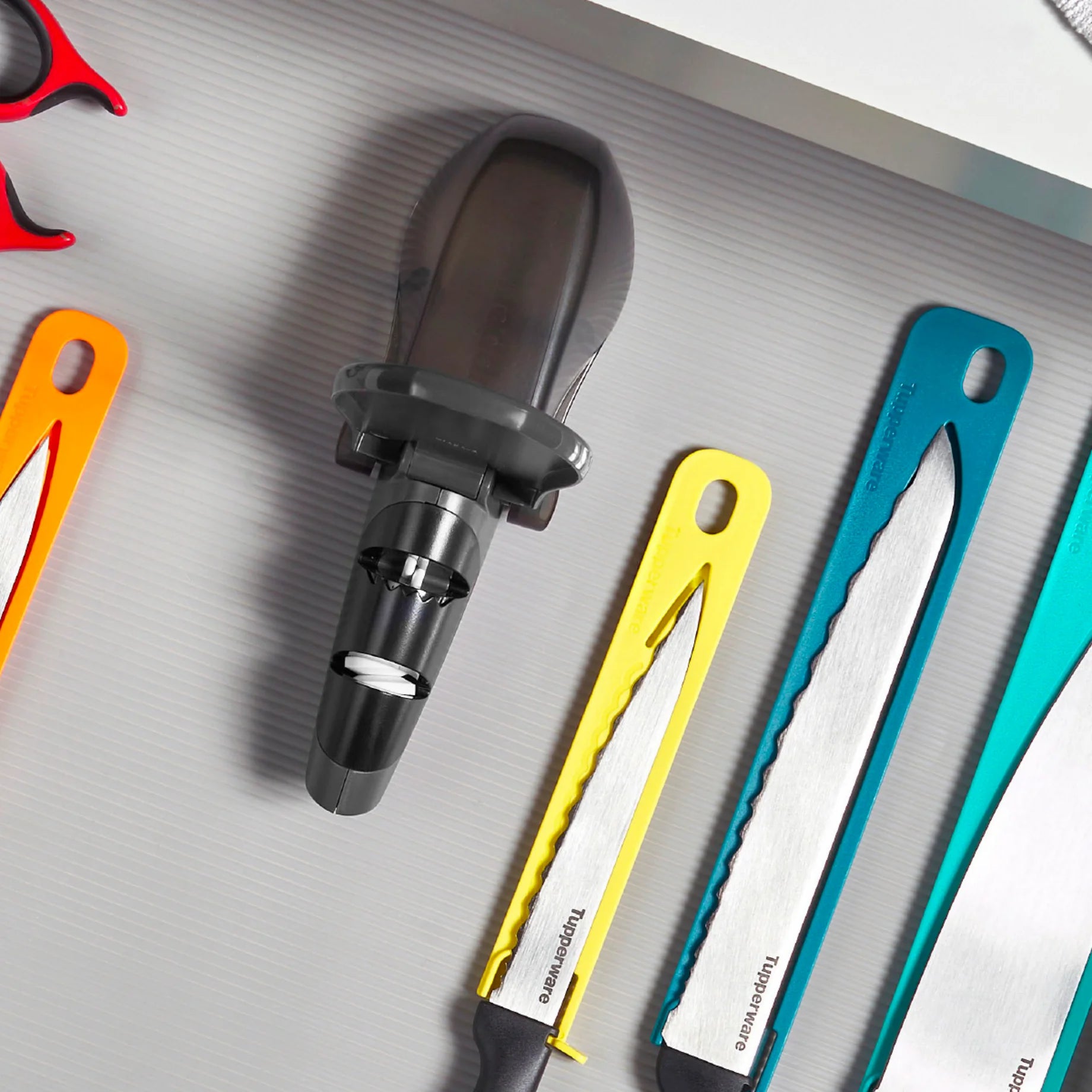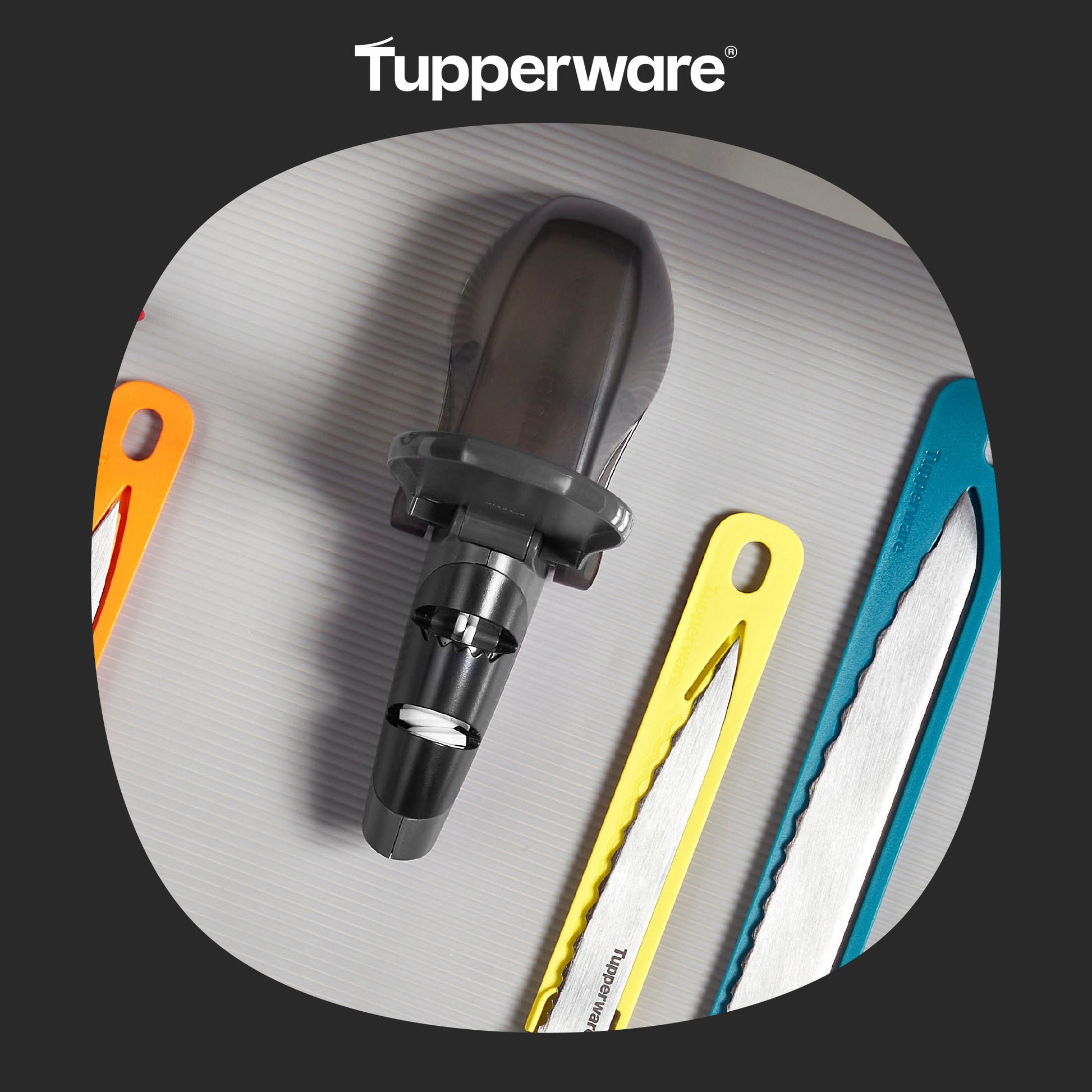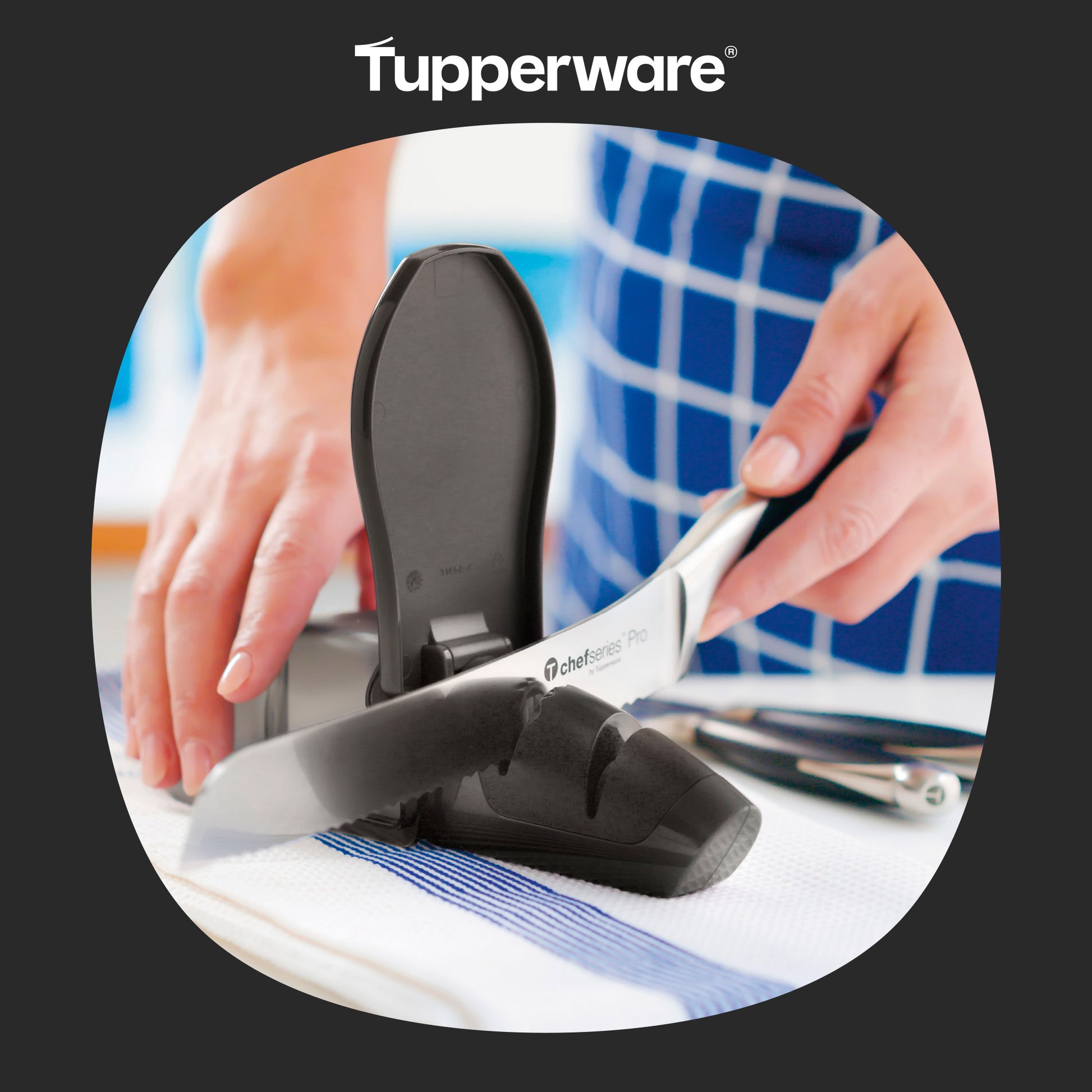Élezd késeidet, mint egy profi! A minőségi kések mindig igénylik az élezést és az élesítést. Védelmezd meg késhasználati értékeid a Tupperware Univerzális Késélezővel. Ez az egyszerűen használható késélező kiváló megoldás a késeid élesen tartására. Már nem kell profi késélezőhöz menned, az innovatív Tupperware Univerzális Késélezővel nemcsak a sima élű, hanem a recés késeidet is élezheted! A késélező mellé tartozik egy védőpajzs is, amely eltakarja a kések éles élét és védi a kezed, miközben használat közben a csúszásgátló lábak megfogják a késélezőt az asztalon. Ez a késélező tökéletesen passzol a Tupperware késeihez. Az Univerzális Késélező és egy szett Tupperware kés ideális ajándék lehet szinte bárkinek, beleértve az egyetemi hallgatókat, fiatal párokat vagy a feltörekvő séfeket! Használaton kívül az élező összecsukható, kompakt, helytakarékosan tárolható.