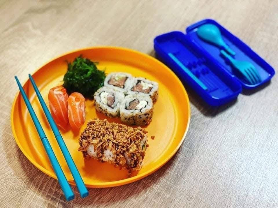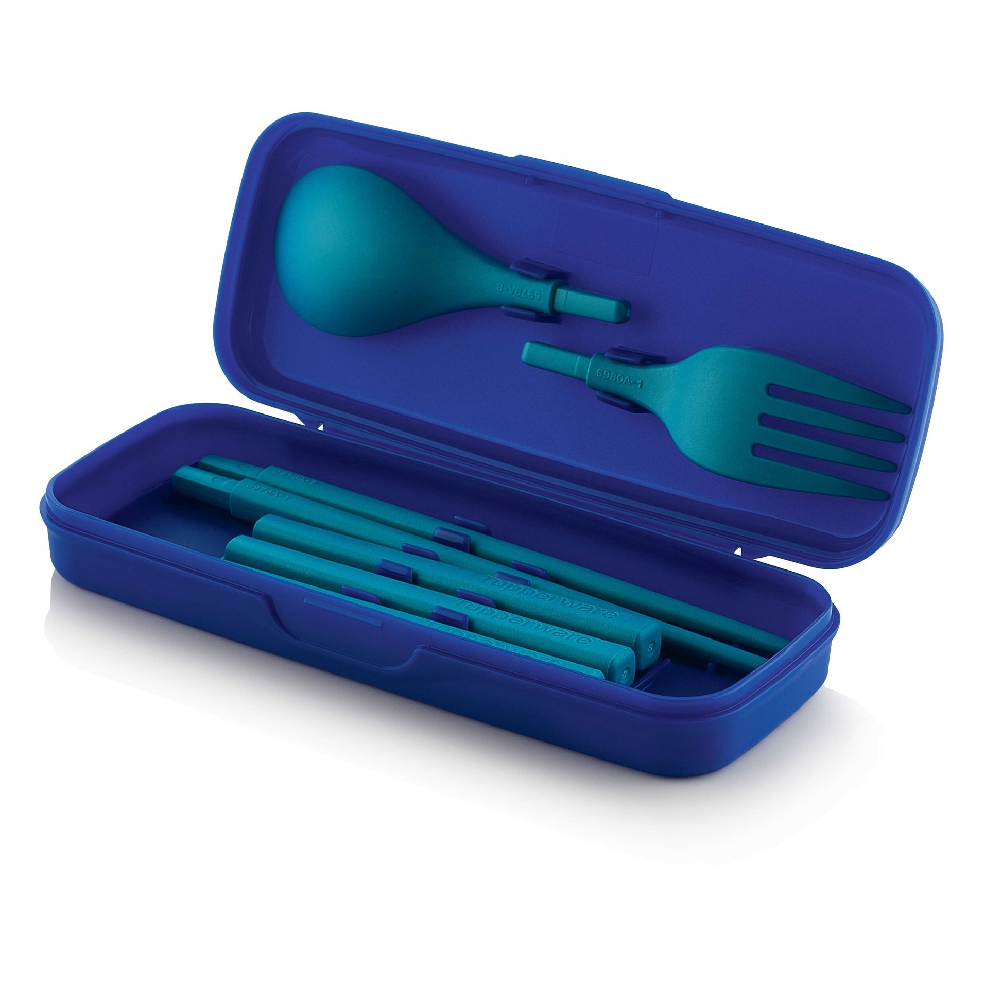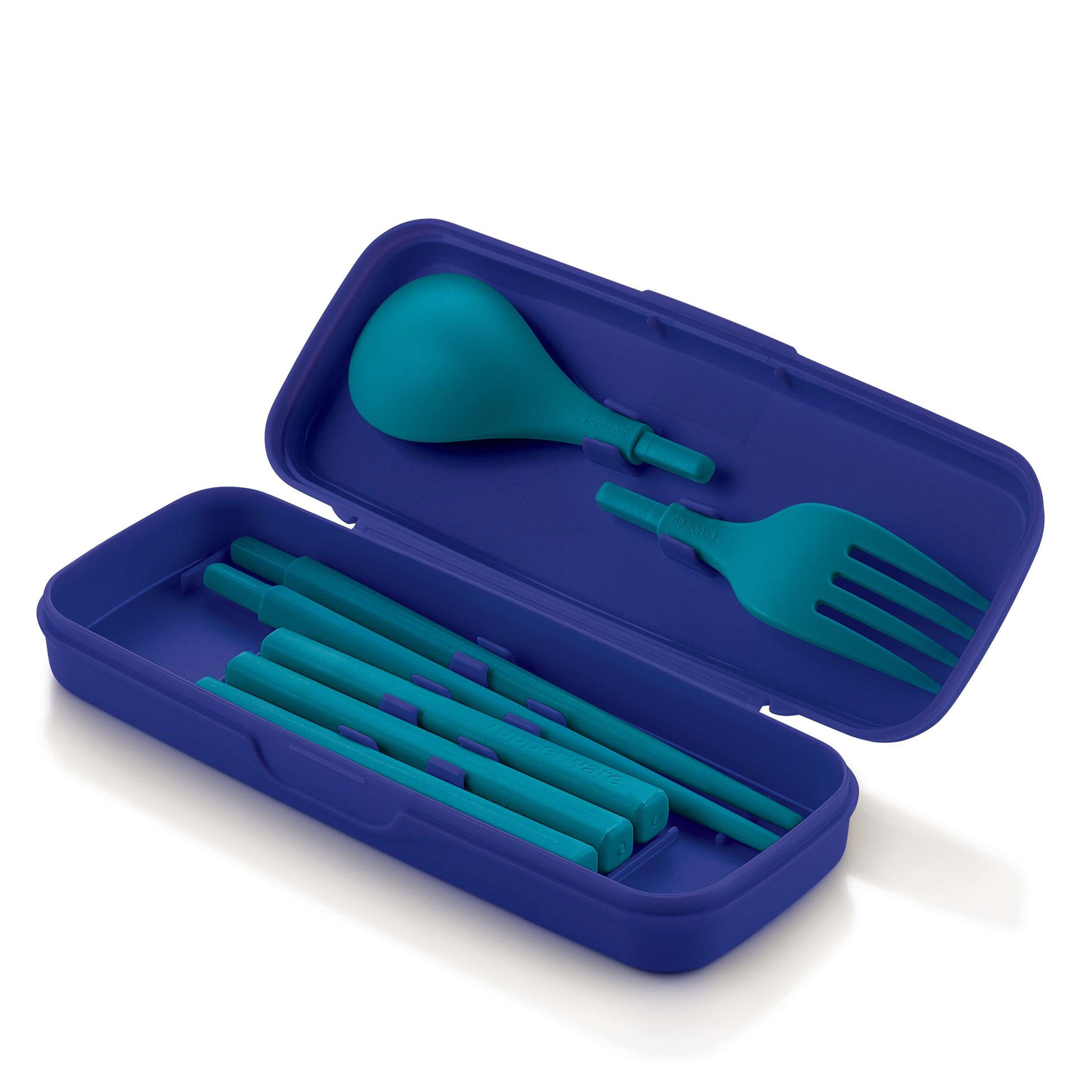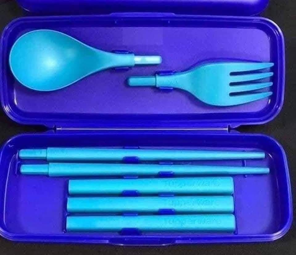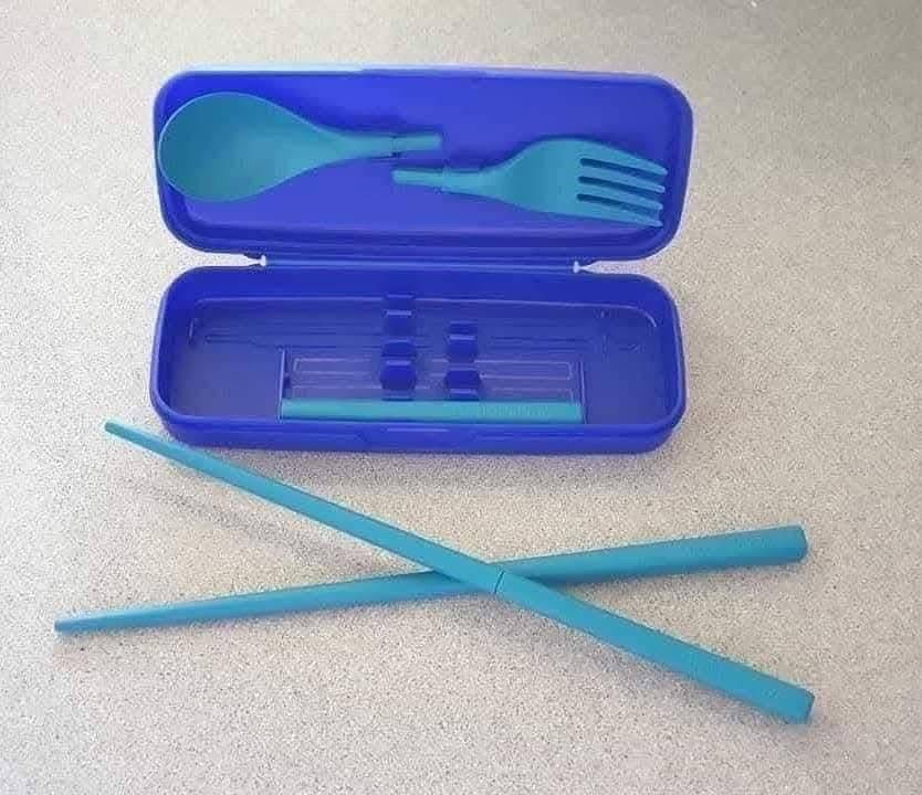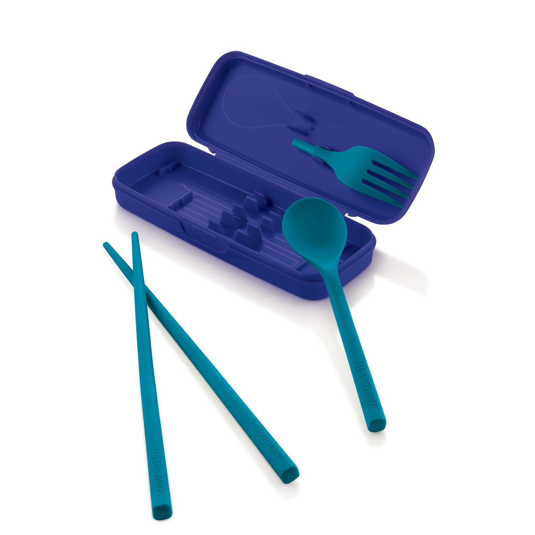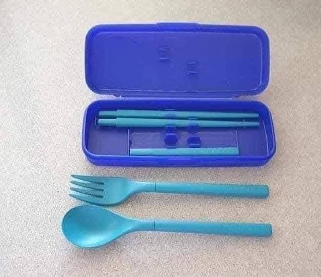 Újrafelhasználható kanál, villa és evőpálcika szett, tartó doboz