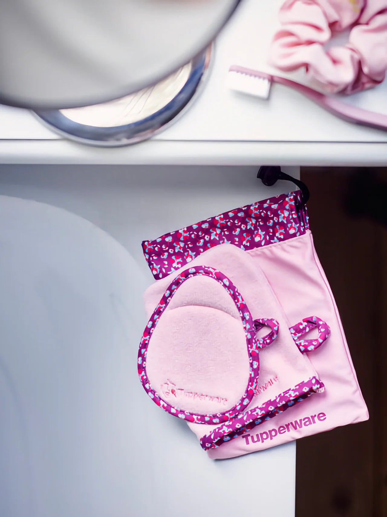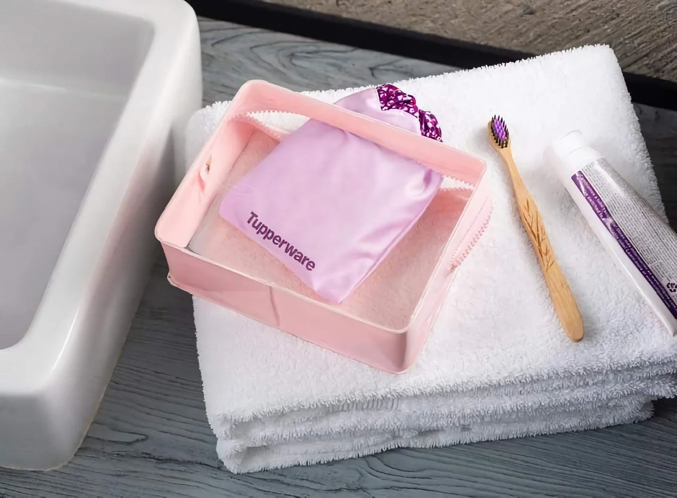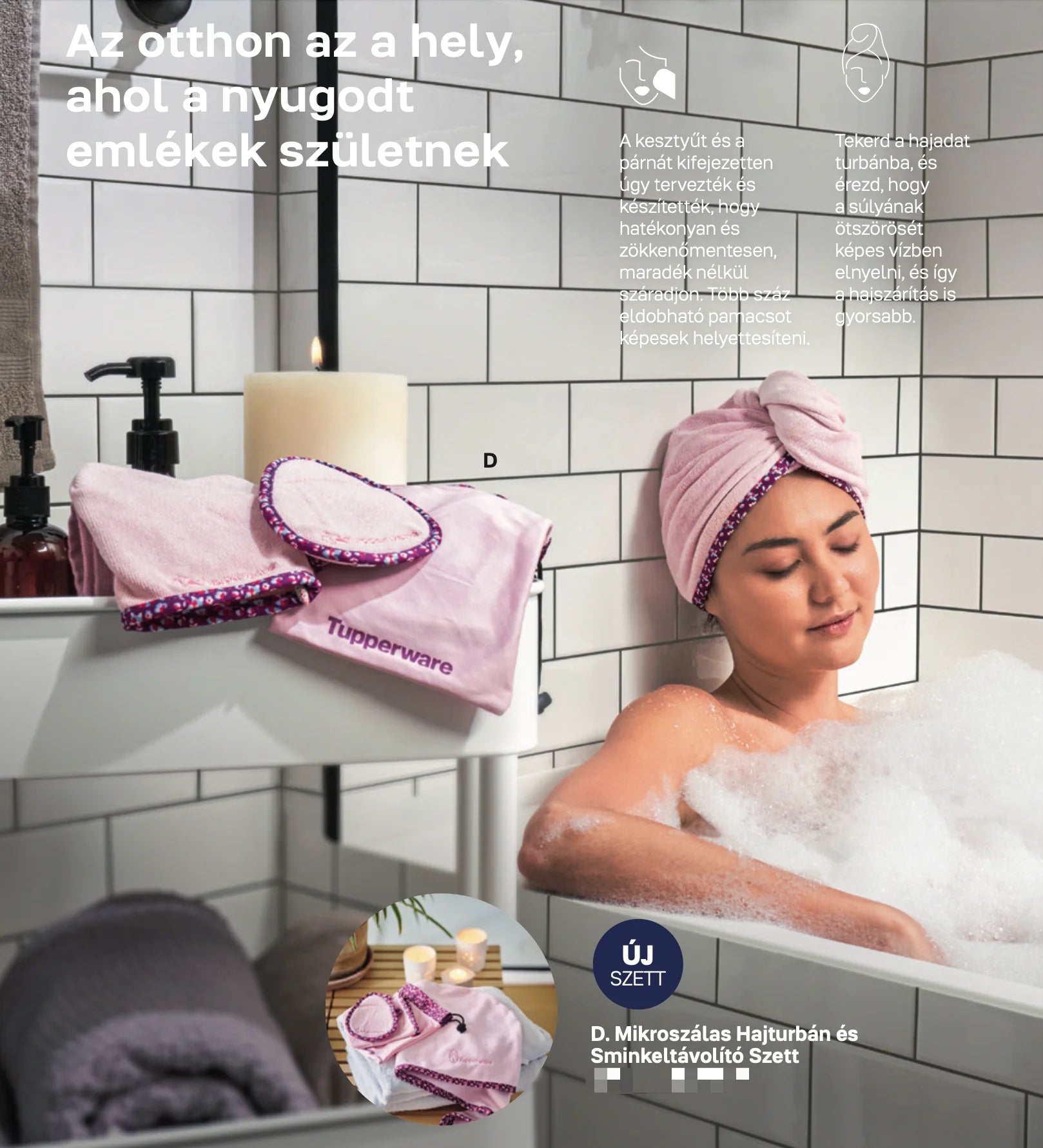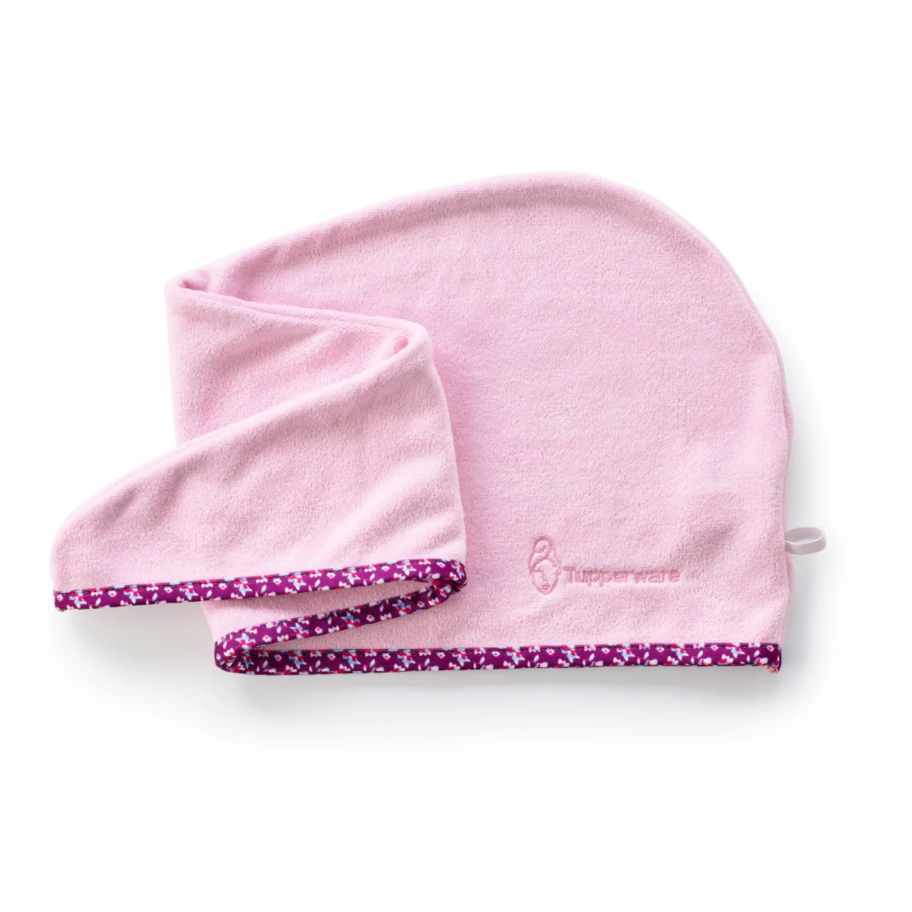 Cselekedj fenntarthatóan: újrahasznosított mikroszálas hajturbán. A Tupperware zseniális tervezése ötvözi az újrahasznosított poliésztert és a poliamidot egy praktikus személyes ápolási termékkel, amely a mikroszálak abszorbens tulajdonságának köszönhetően gyorsan felszívja a vizet és csökkenti a szárítási időt.