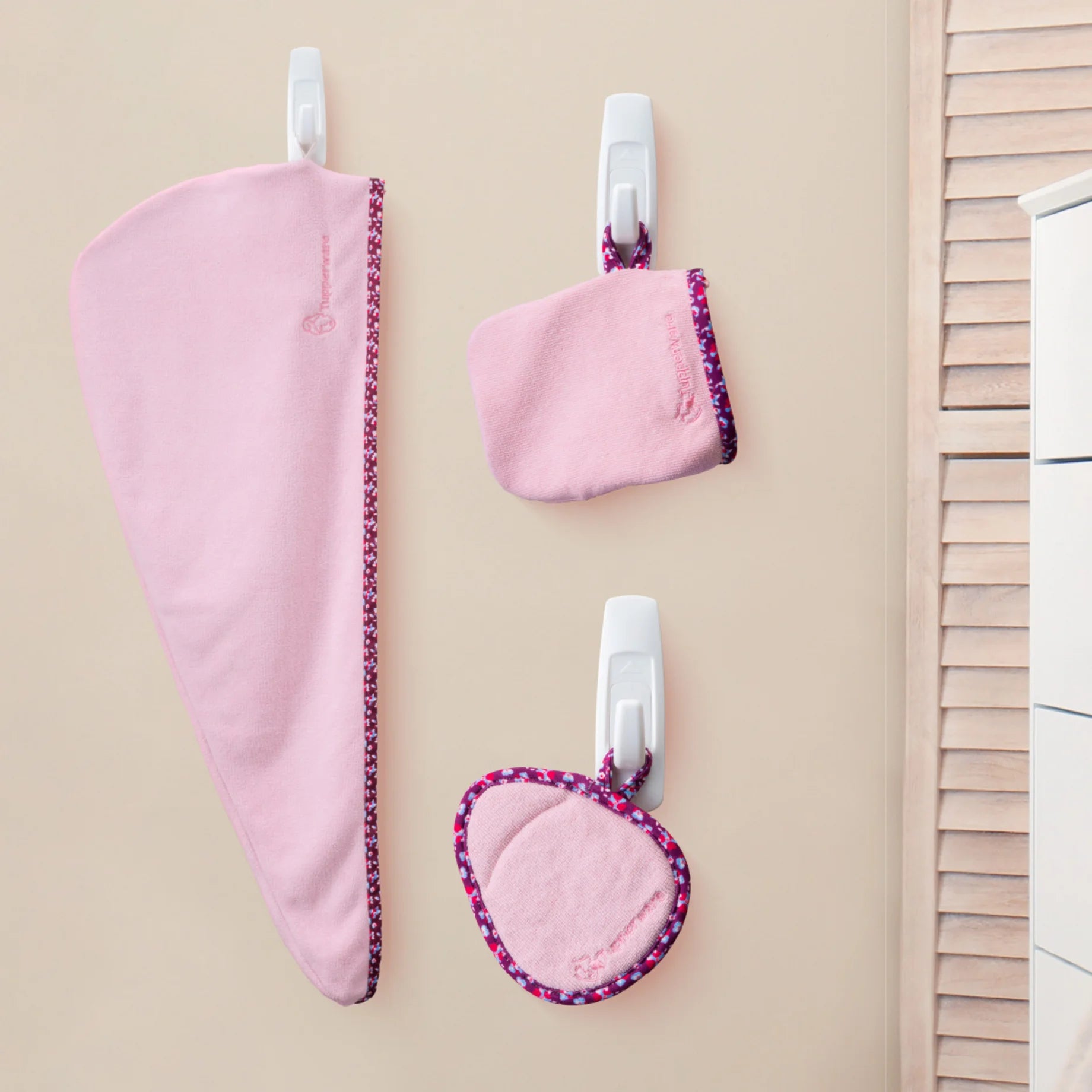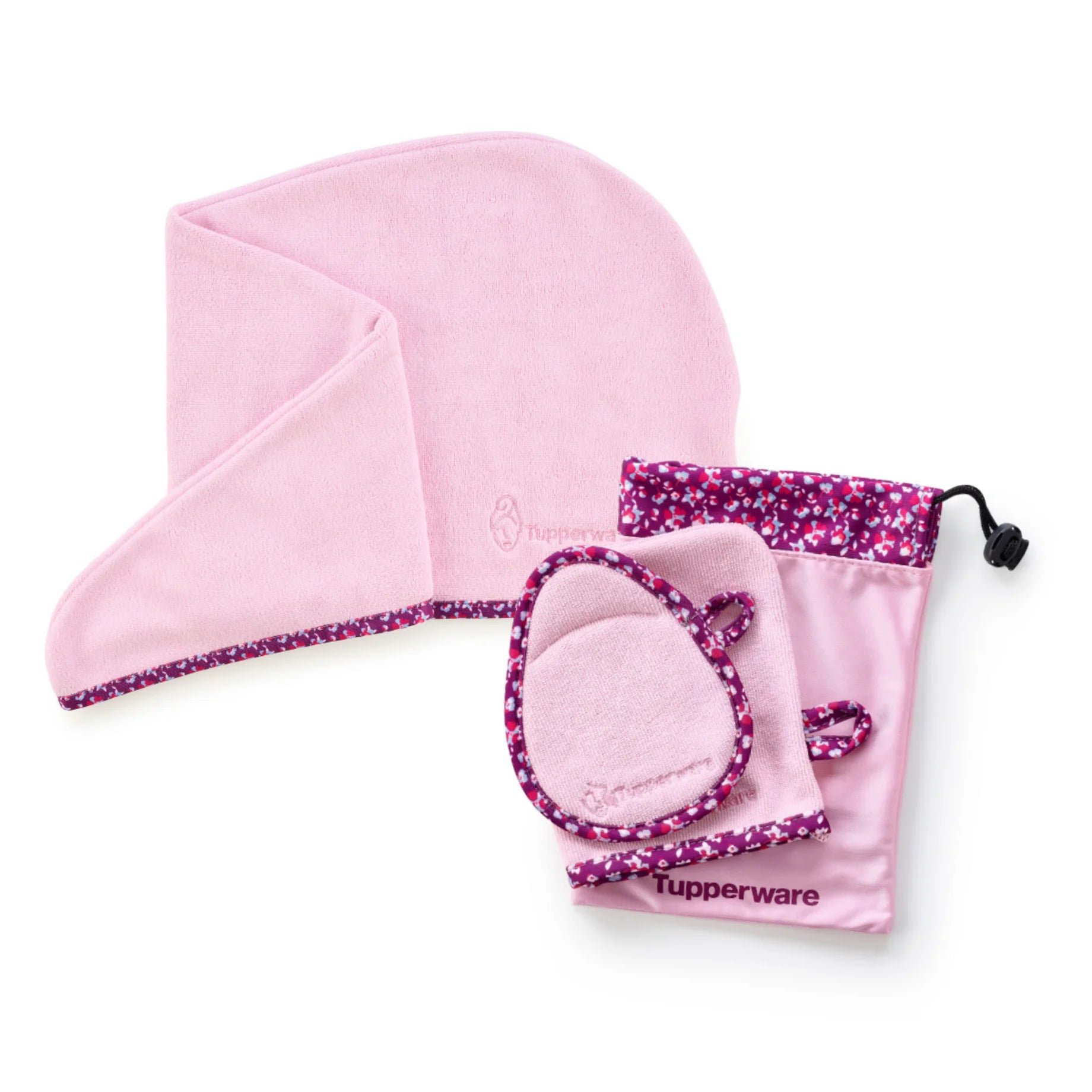 Egy praktikus arctisztító törölközőből, egy párnából a smink és társai alapos eltávolításához, a hajturbánból, valamint egy tárolózacskóból áll.