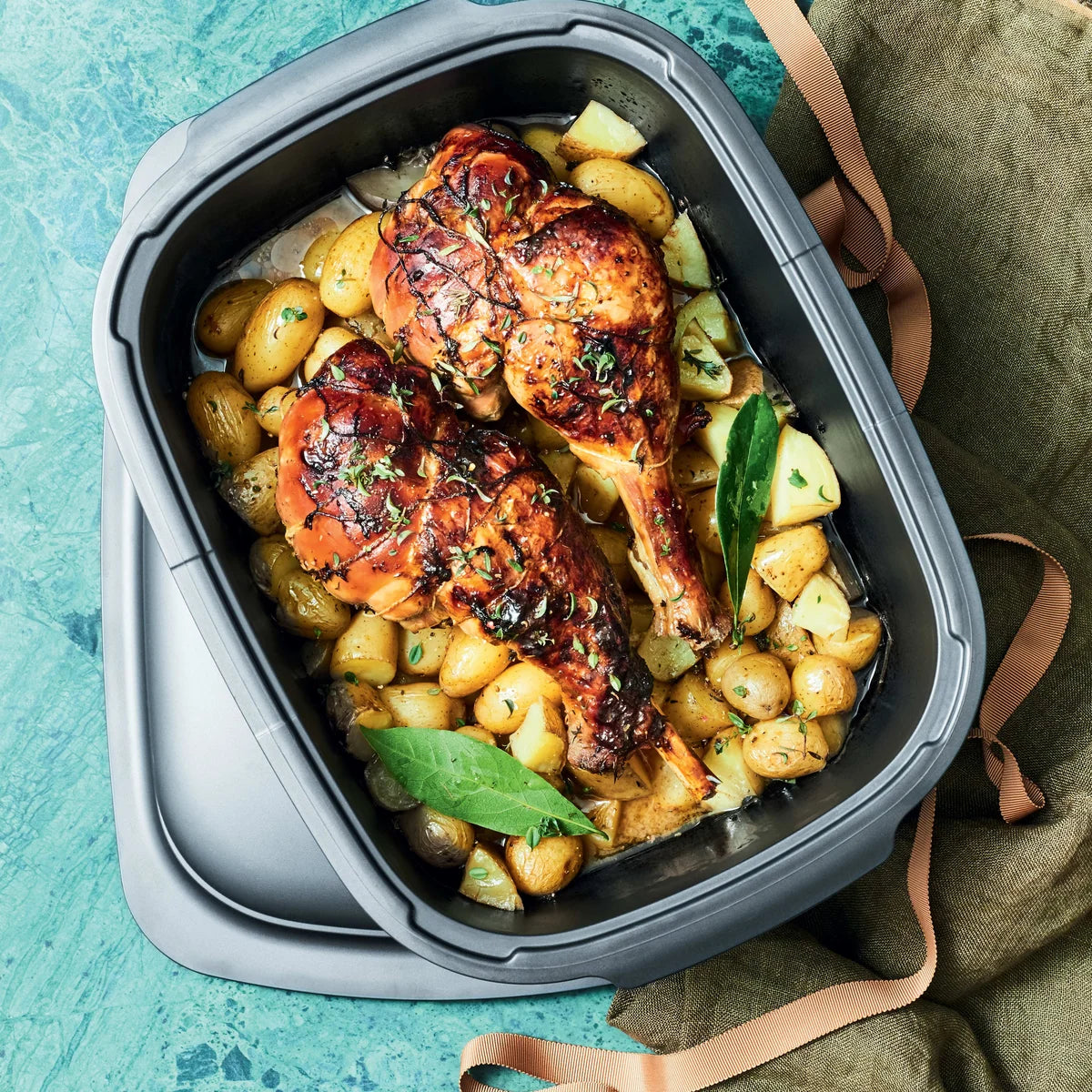 - 5,7L és 3,3L-es alj együtt, 1,2-es tetővel: Szeretnél egy sültet, libát vagy pulykát készíteni, vagy egyszerűen csak egy nagyobb adag finom levest? Nagyobb mennyiségű húsok mellett ajánljuk még pl. zöldségek elkészítéséhez. Kacsasütésénél a 3,3L-as aljat használhatjuk az 5,7L-es fedőjeként.
