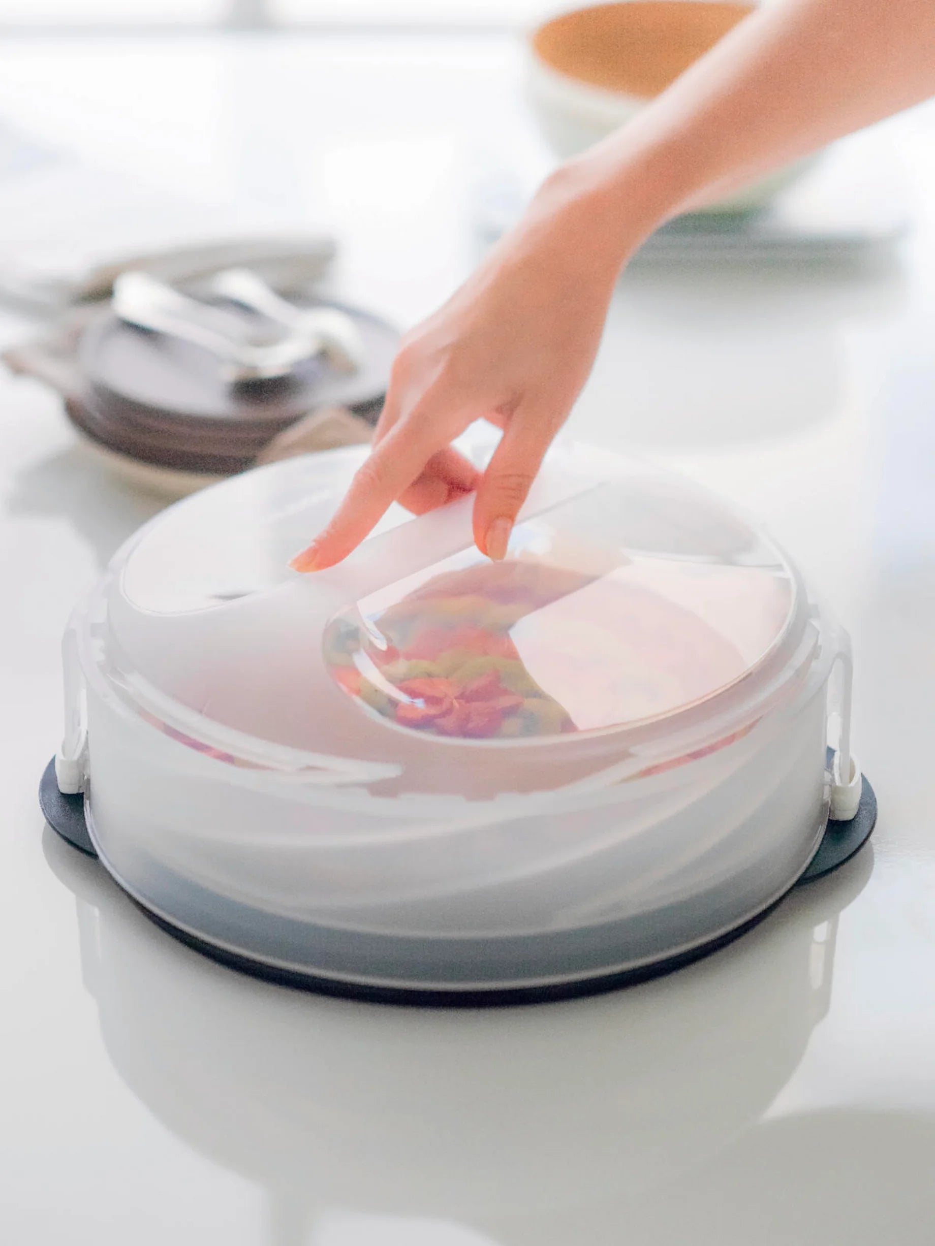 Az állítható fedél magassága 7,5 cm-től 13,5 cm-ig terjed, hogy mindent el lehessen benne helyezni a pitétől a réteges tortákig, majd egyszerű csavarással össze lehet hajtani, hogy helyet takaríts meg, amikor nincs használatban.
