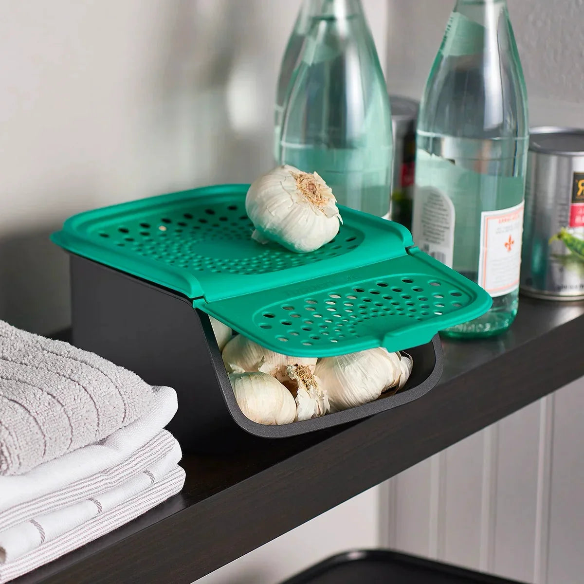 Elrendezve és elérhető helyen tartja a fokhagymát, hagymát, mogyoróhagymát, burgonyát és egyebeket, még a legkisebb konyhában is.