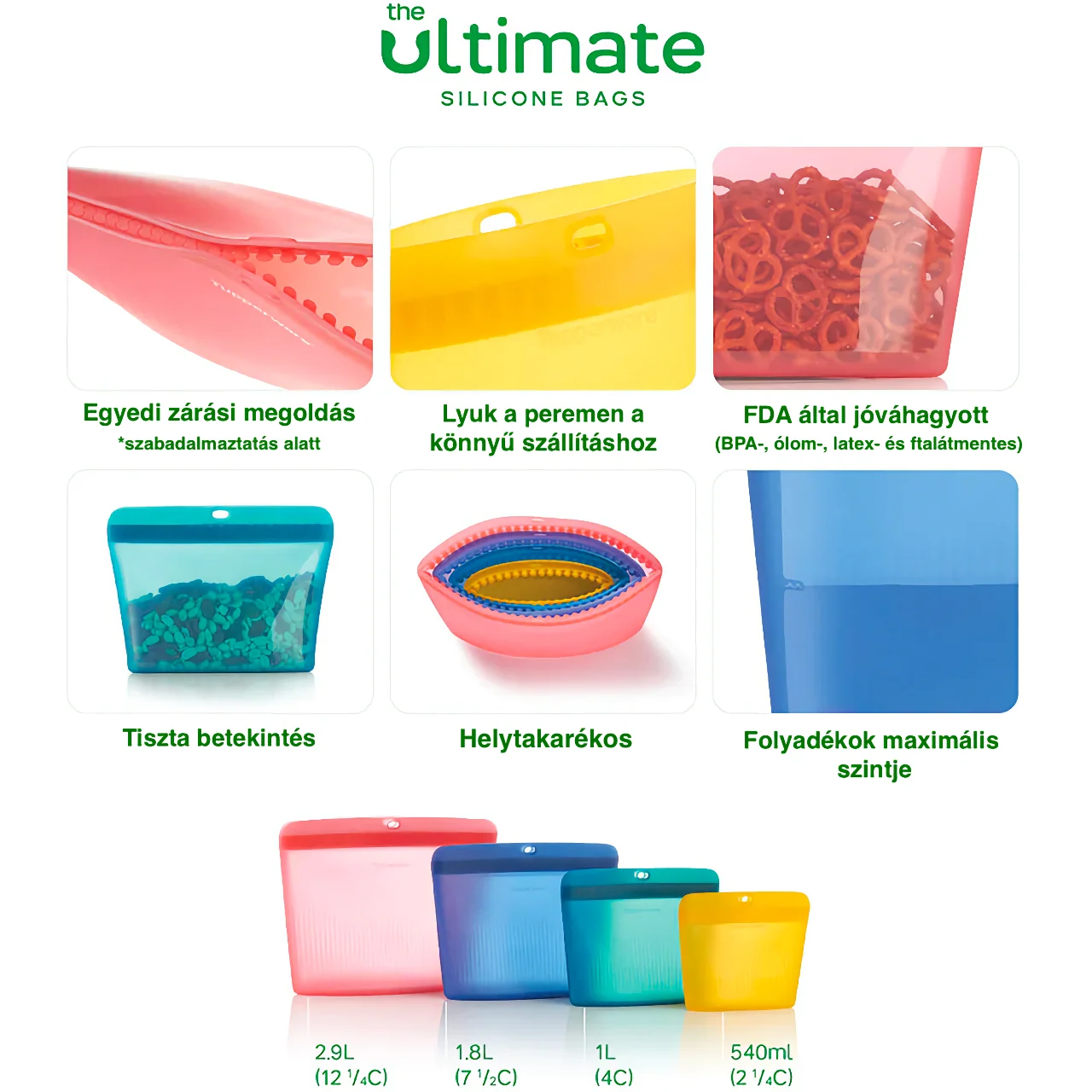 Univerzális, újrahasznosítható Ultimate Szilikon tasakjainkkal magabiztosan tárolhatsz, főzhetsz, fagyaszthatsz, kiolvaszthatsz és rendszerezhetsz, anélkül, hogy életmódodban kompromisszumot kellene kötni. Bízhatsz tartósságukban és hosszú távú megbízhatóságukban. Zökkenőmentességükre számíthasz a hűtőszekrénytől a fagyasztóig, a főzéstől a túrázásig.