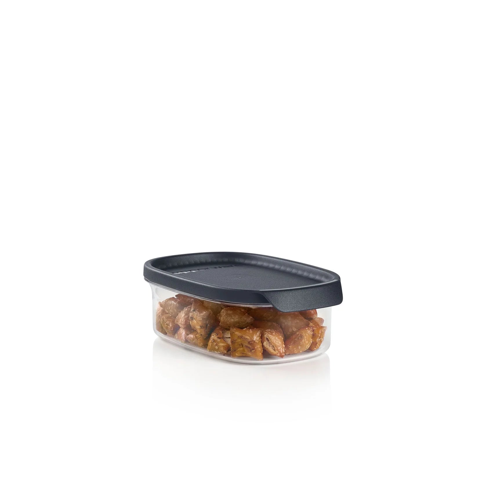 Zárás: Helyezd a megtöltött tárolót asztalra vagy más lapos, stabil felületre. Igazítsd a fedelet a tároló aljához. Határozottan csúsztasd a hüvelykujjad a perem szélein a fül felé.