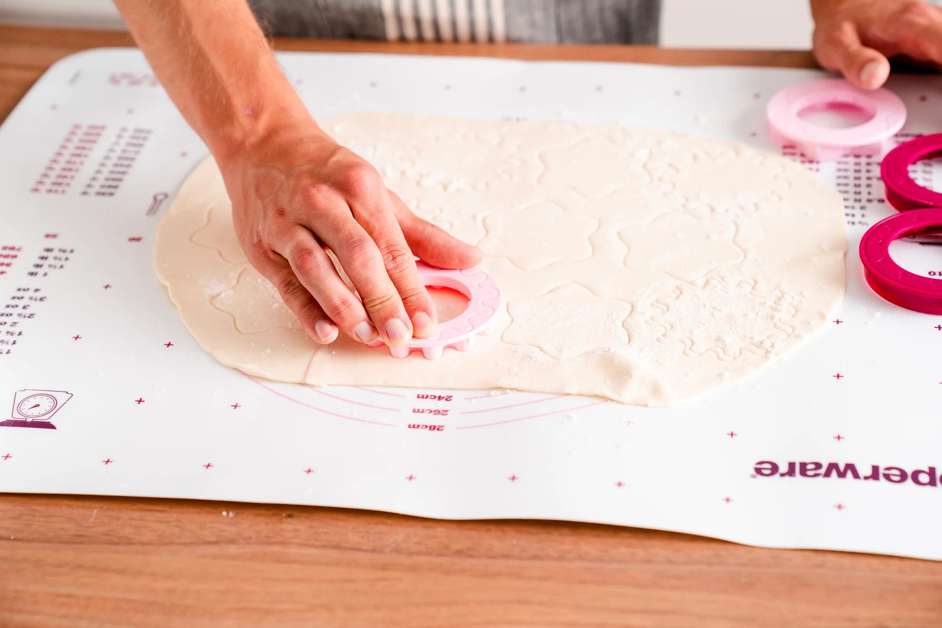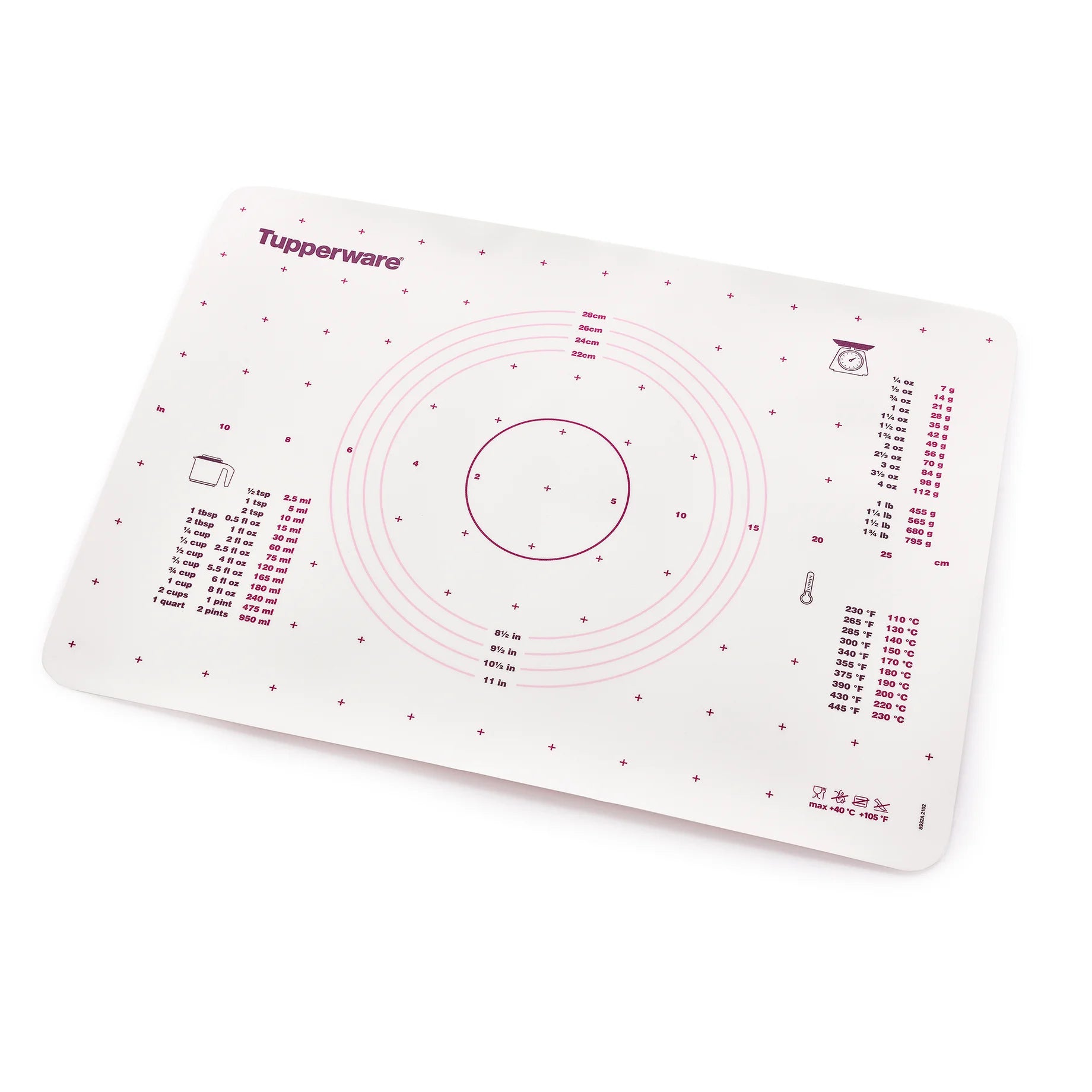 Egy nagy, csúszásmentes munkafelület - rendkívül praktikus mind a nagy, mind a kis sütőművészek számára. Sok segédanyaggal, amelyek közvetlenül rá vannak nyomtatva.