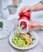 A bajonettzár kellő biztonságot nyújt. Biztonságosan összeköti a vágóbetétet és a házat. Ezután egyszerűen rögzítsd az 5-10 cm-es darabokra vágott zöldségeket, az egyik kezedben tartsd a házat, másik kezeddel helyezd be az ételt a betétbe, és enyhe nyomással fordítsd meg. Ergonomikus formájának és barázdált felületnek köszönhetően a spirálvágó kényelmesen használható.