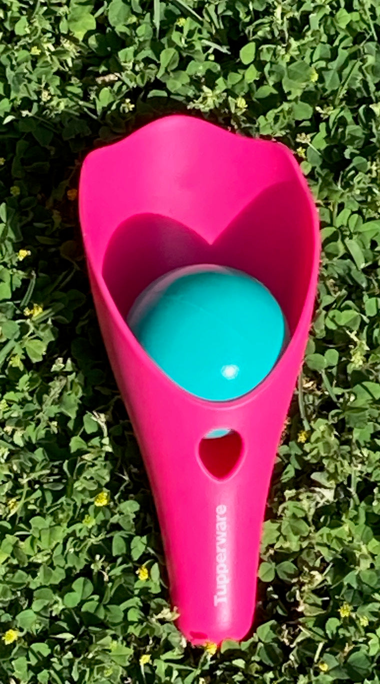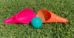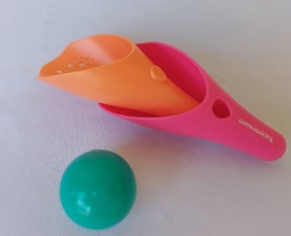 Két kis tölcsér és egy labda. A tölcsérek kialakításakkor figyletek arra, hogy a kicsik kezében könnyen elférjen és könnyedén tudják fogni, ezáltal elkapni a labdát.